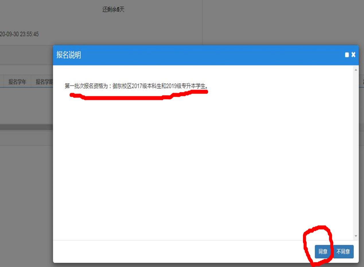 4.查看“报名说明”。是自己所在年级的报名批次,点击“同意”;如果不是所在年级,则点击“不同意”,选择其他批次报名。